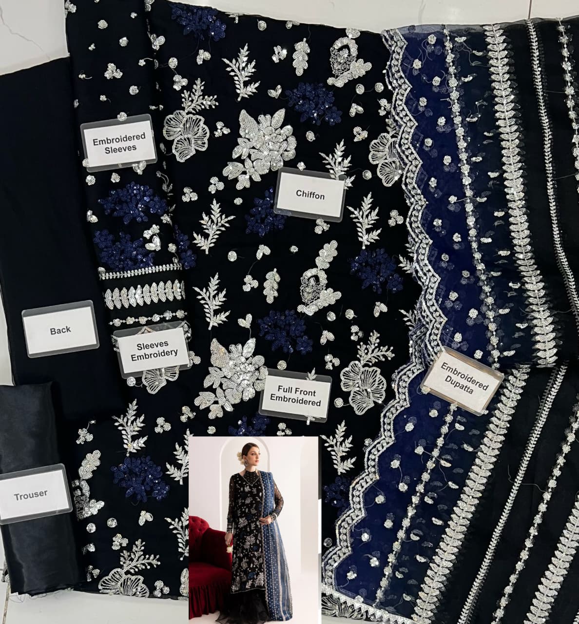 Front: Chiffon Embroidered with Sequence & Adda Work